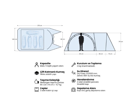 • Çadır: ~ 375 cm x ~ 245 cm x ~ 175 cm
