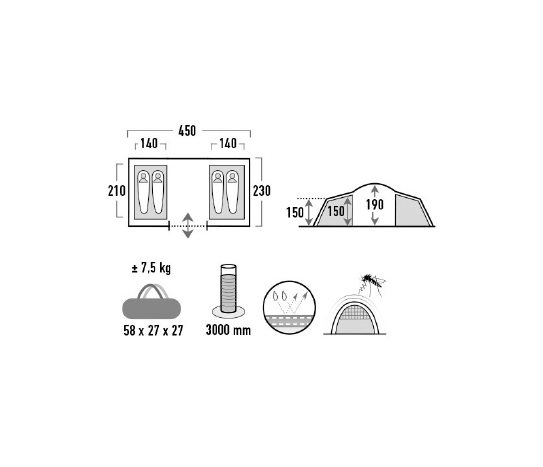 • Fiberglass poller. Hafif fiberglass poller-Bantlı 3000m su geçirmez dış tente, Güneşi engelleyen koyu iç tente • 7,5kg ağırlık • Güneşi engelleyen koyu iç tente • Taşıma çantası