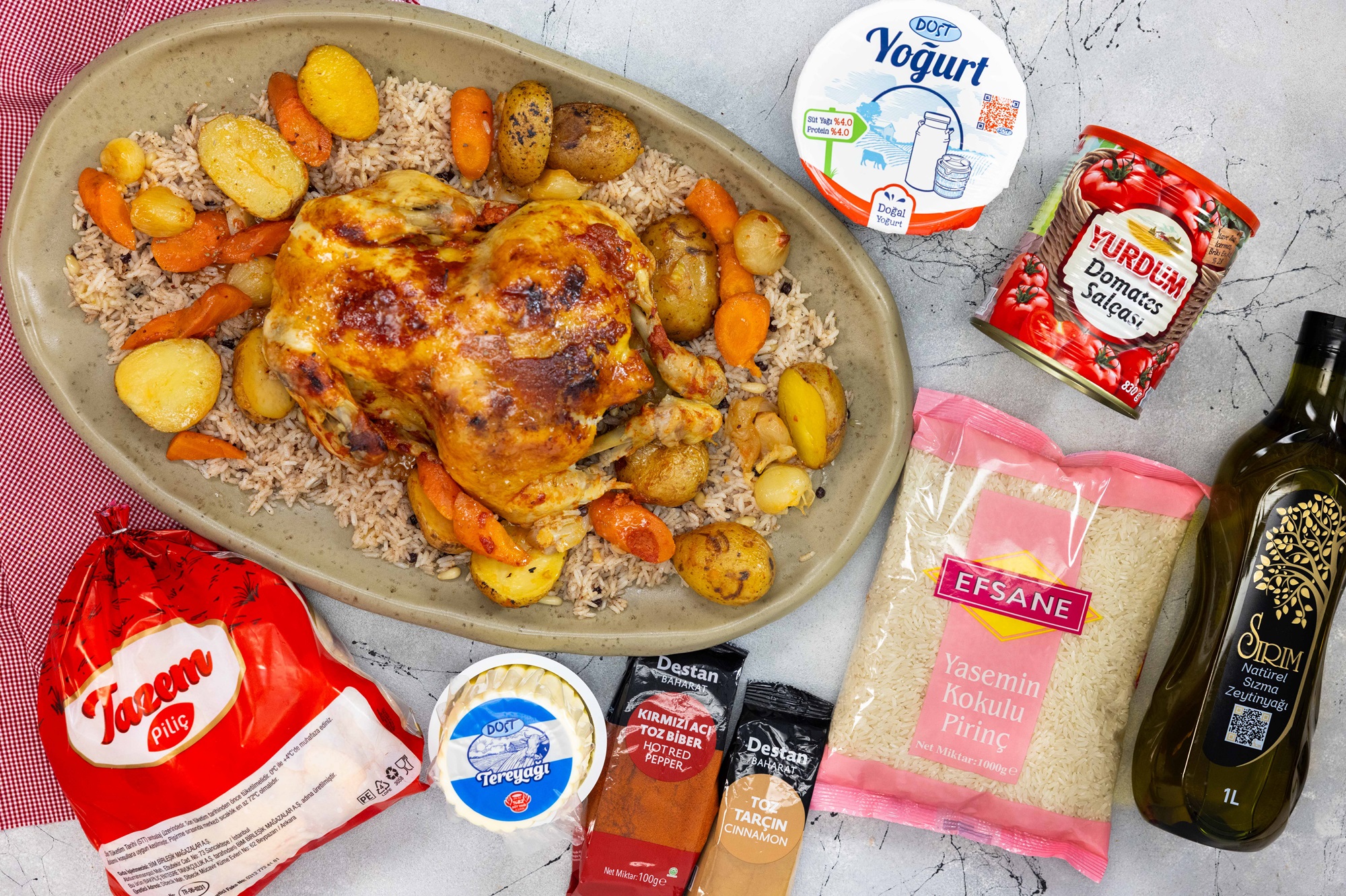 yanlarında kızarmış sebzeler ve lokum gibi pişen tavuk ile masalarınızı
